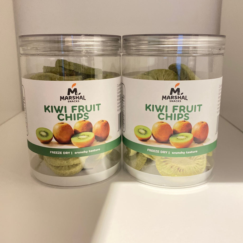 Gevriesdroogde kiwi bevat ongeveer 300–350 kcal per 100 g, maar een portie is klein (5–10 g):